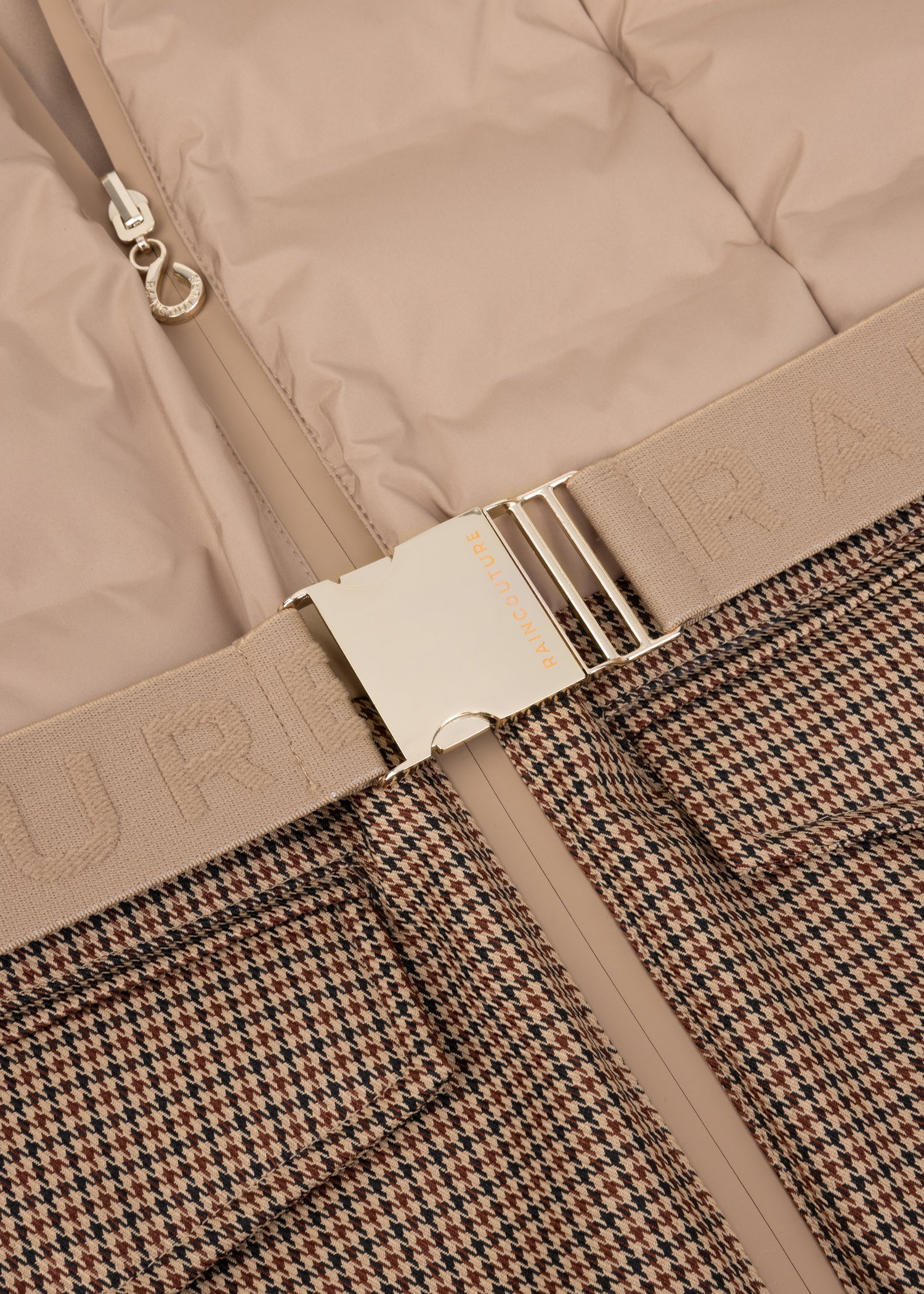 The jacket features a folded hood, zip-off sleeves, and a tailored fit with a belt for a sleek look. Inspired by the slopes, its 2-tone design with distinct fabrics sets it apart from other down jackets. It’s available in a range of elegant colours including beige check, bronze, navy, ivory, vanilla, and green.