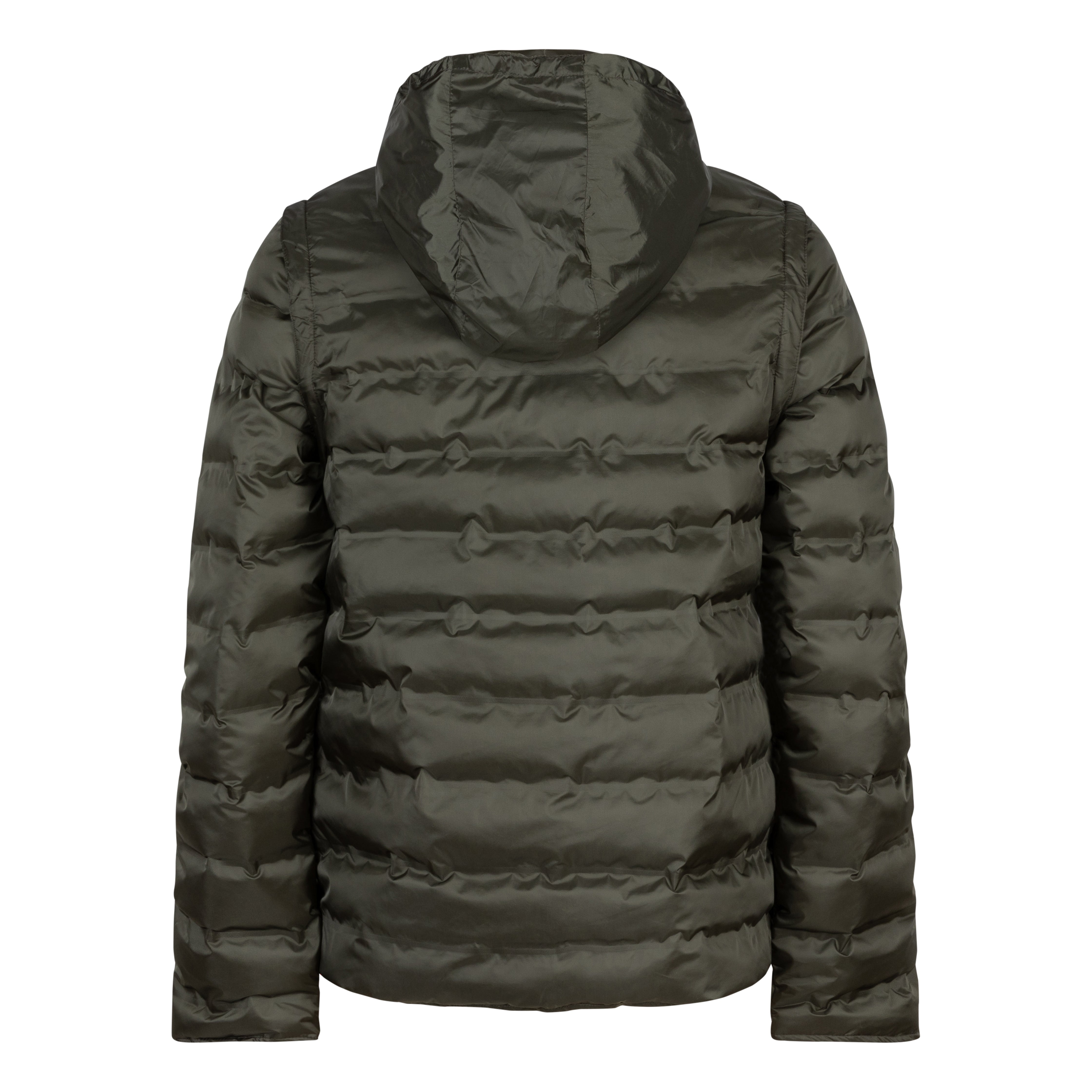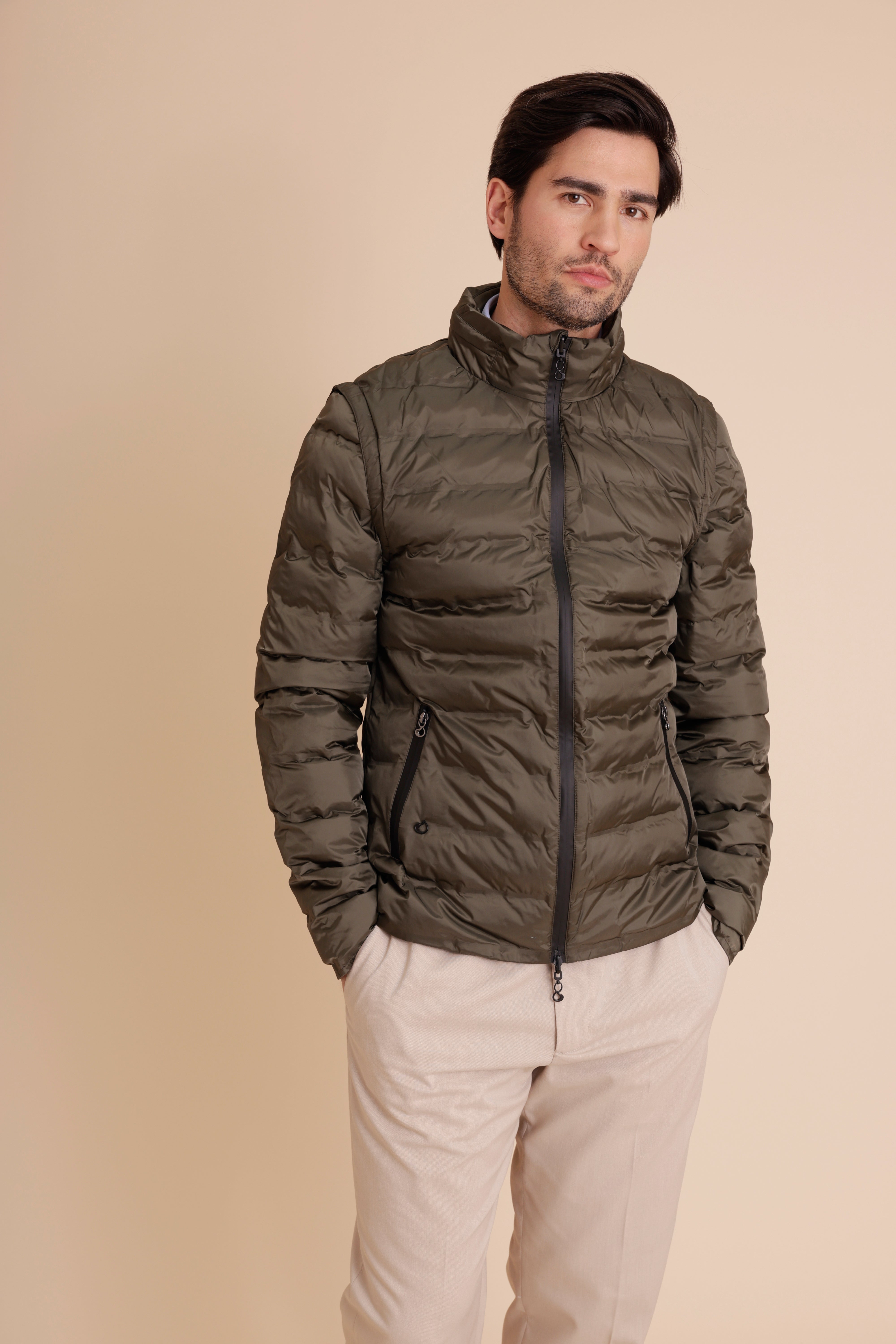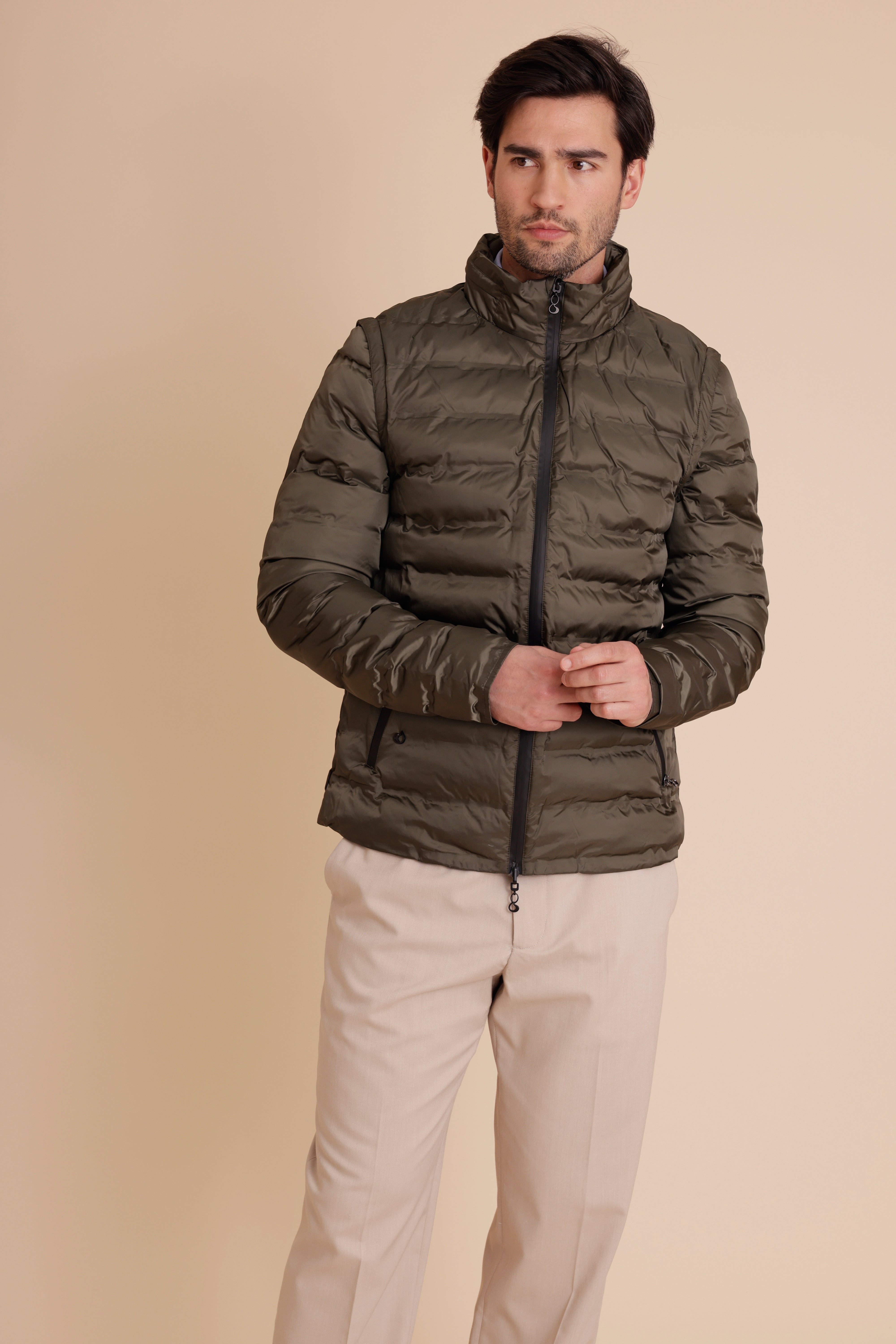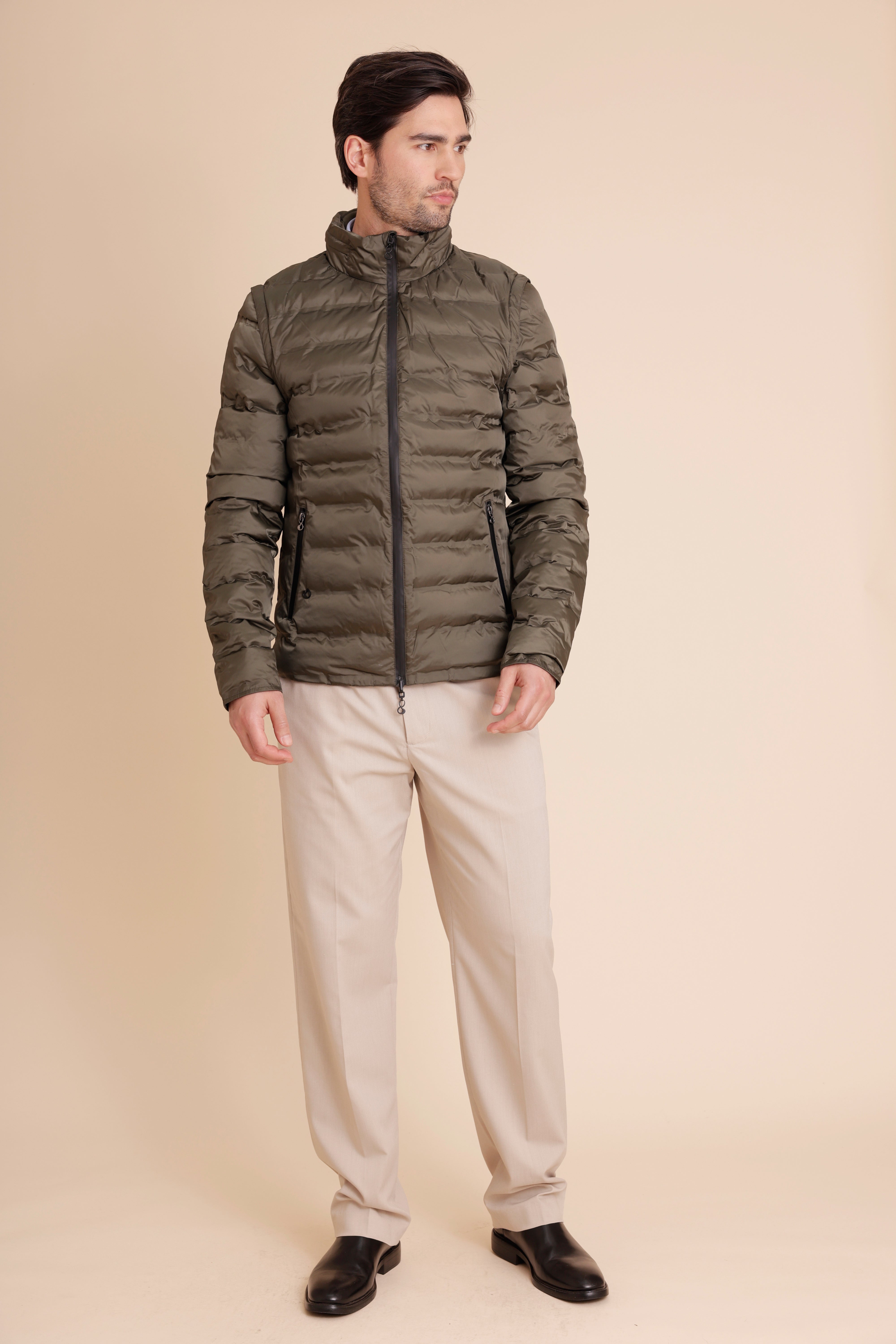 This 3-in-1 men's down jacket features a folded hood, zip-off sleeves, and a tailored fit for a sleek look. It transforms effortlessly into a vest, offering warm, elegant, comfortable, and versatile wear.