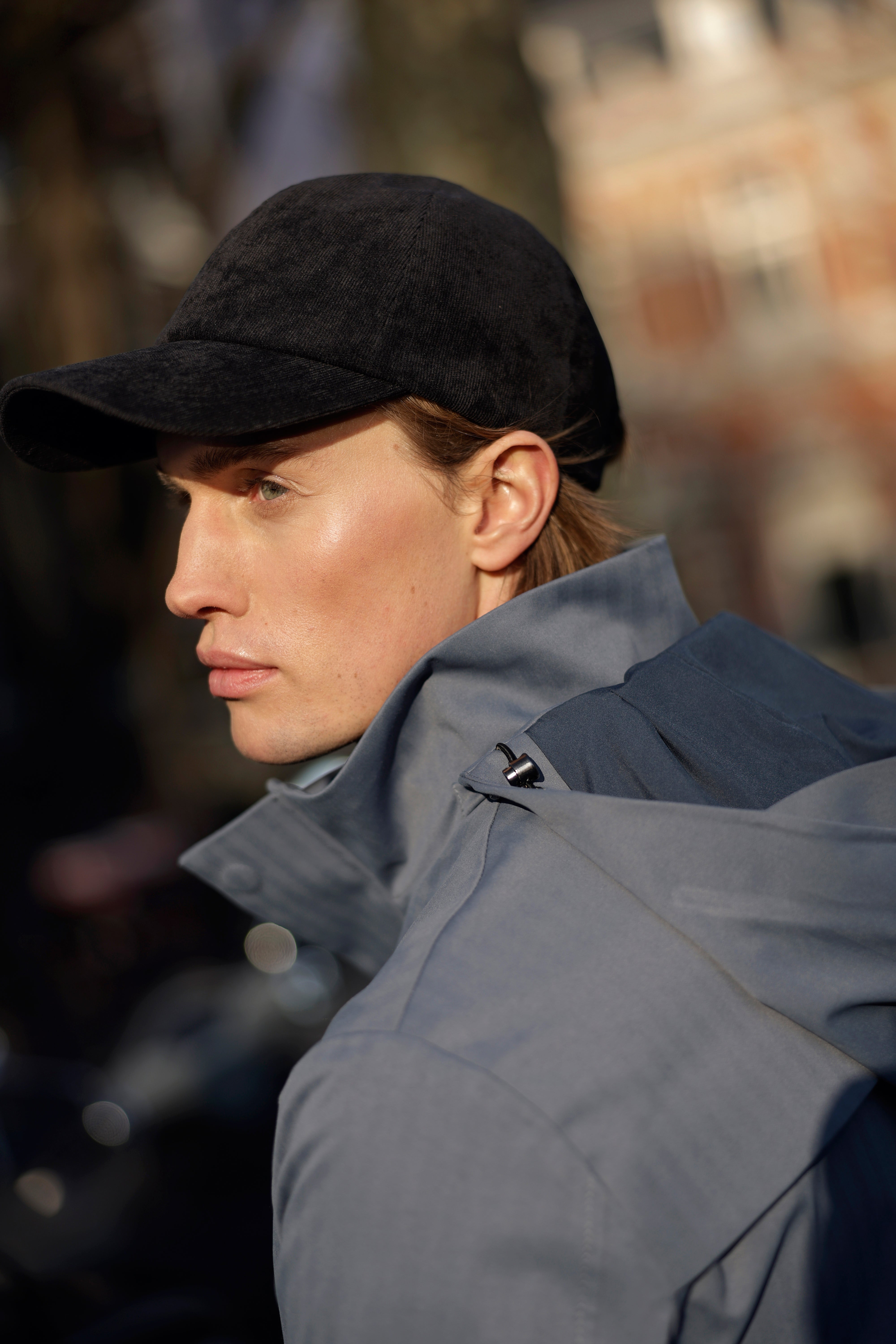 Crafted from recycled cotton and polyester, the Raincouture bucket hat ensures durability and style. It's the perfect accessory to pair with your Raincouture coat. The bucket hat also includes a detachable cord for added convenience and security.