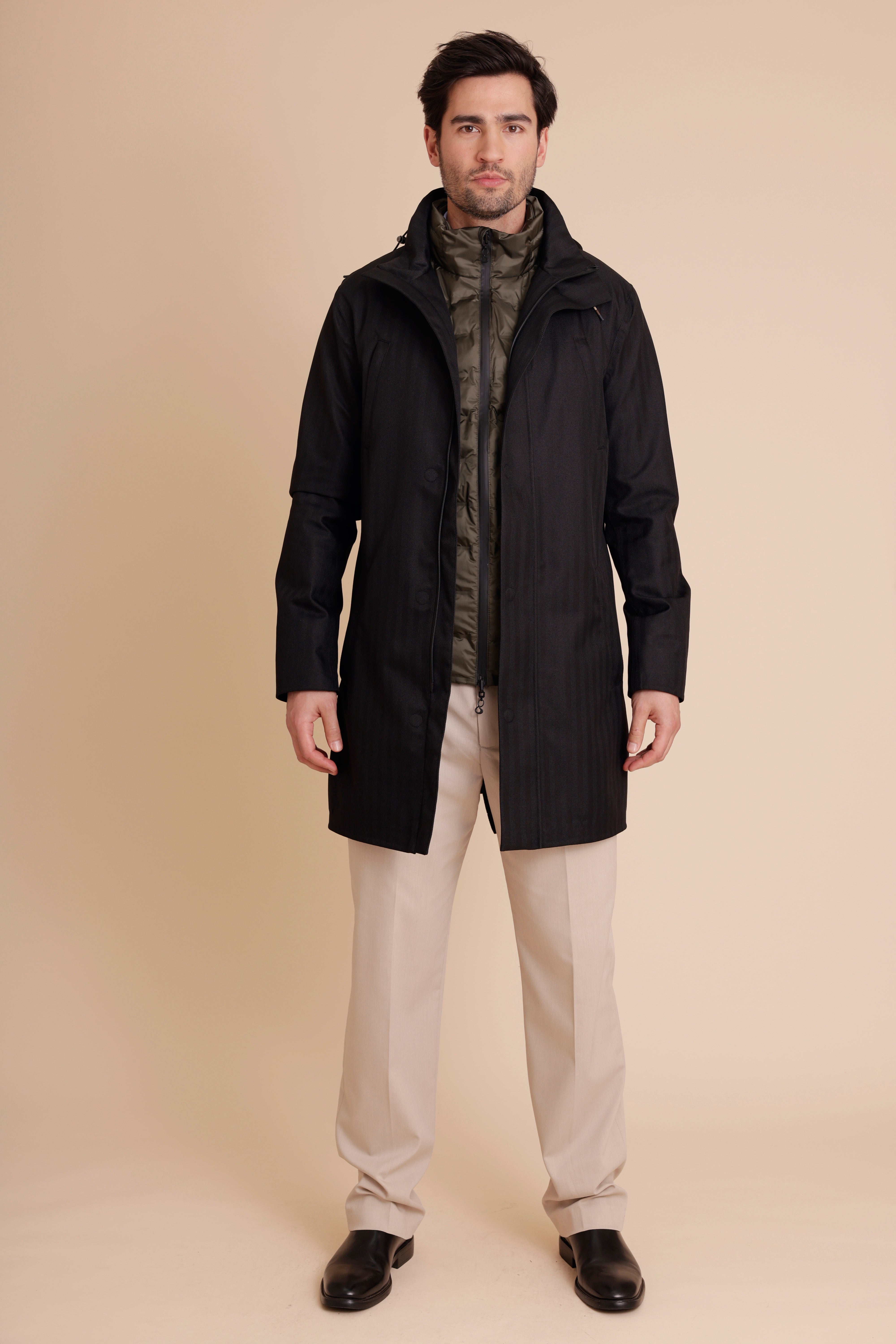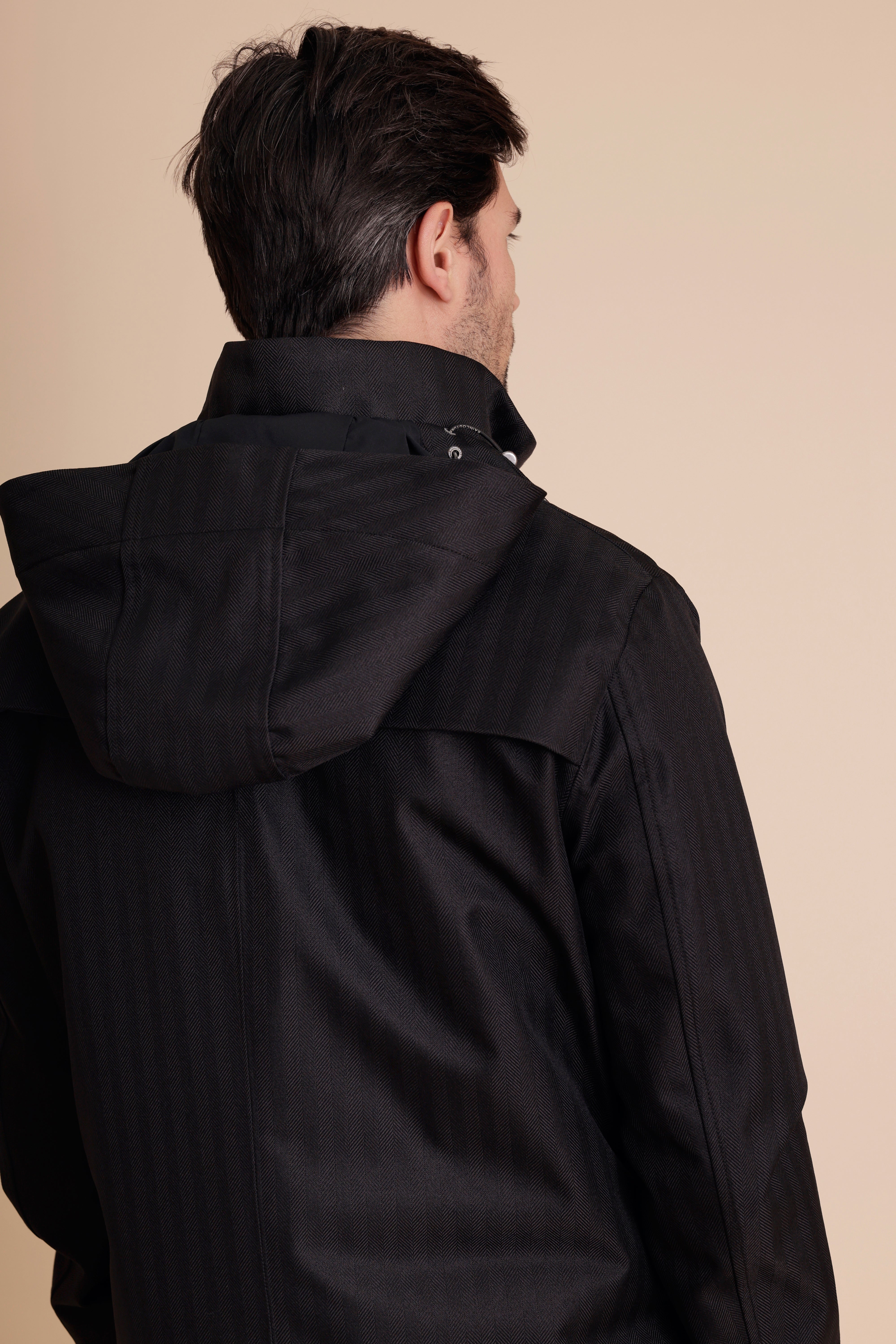 This parka features a zip-off hood, a high collar, and waterproof zippers, ensuring you stay dry in any weather. The luxury herringbone material is both waterproof and breathable, providing comfort and durability. With multiple pockets, this parka combines clean design with practical functionality.