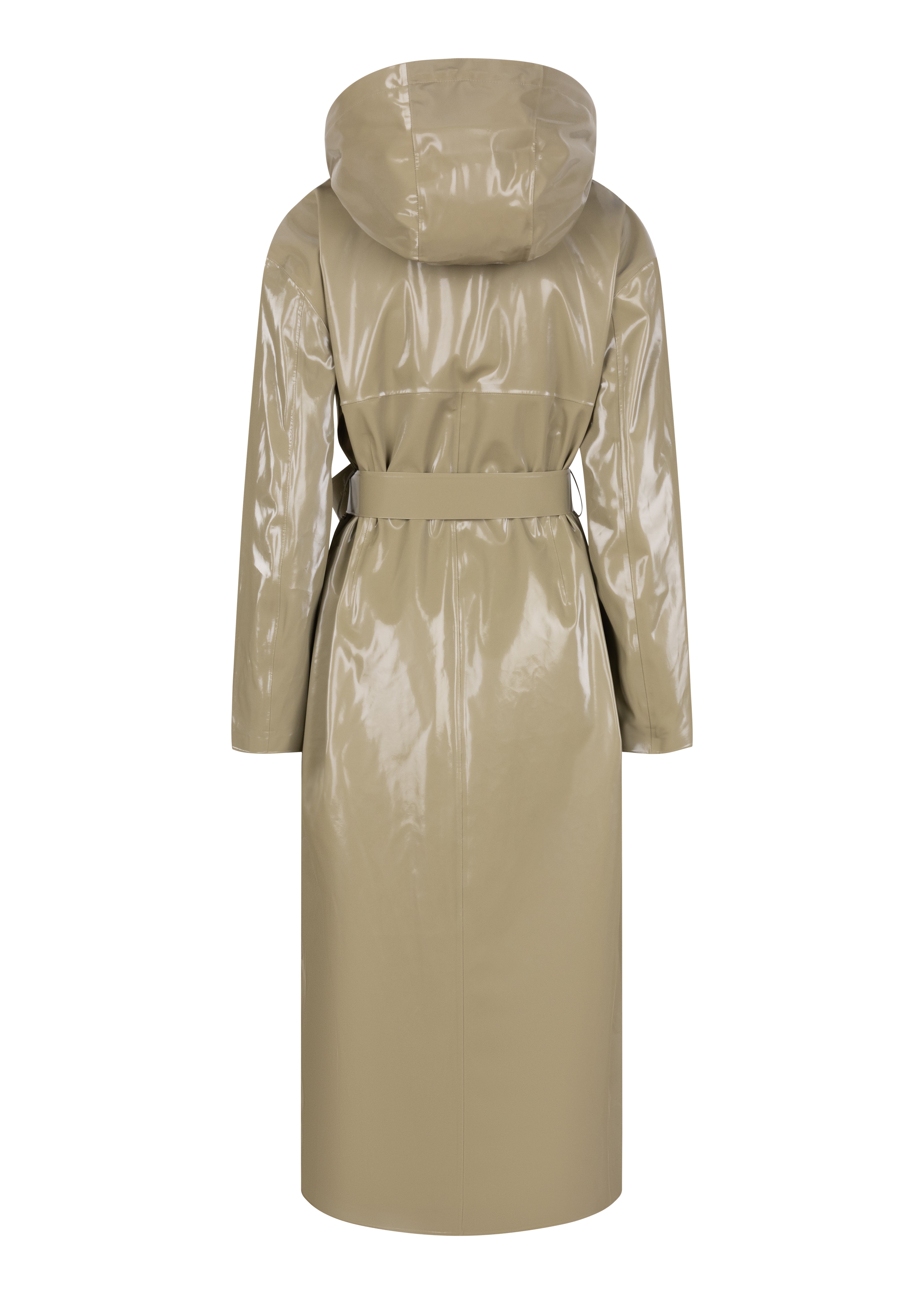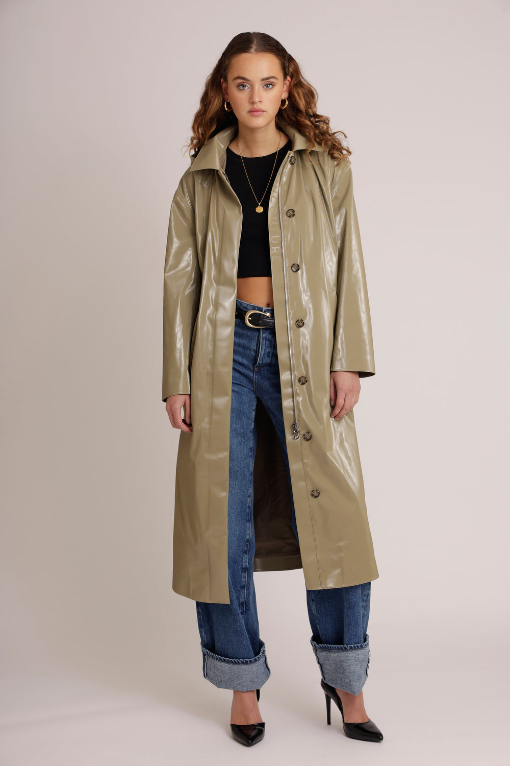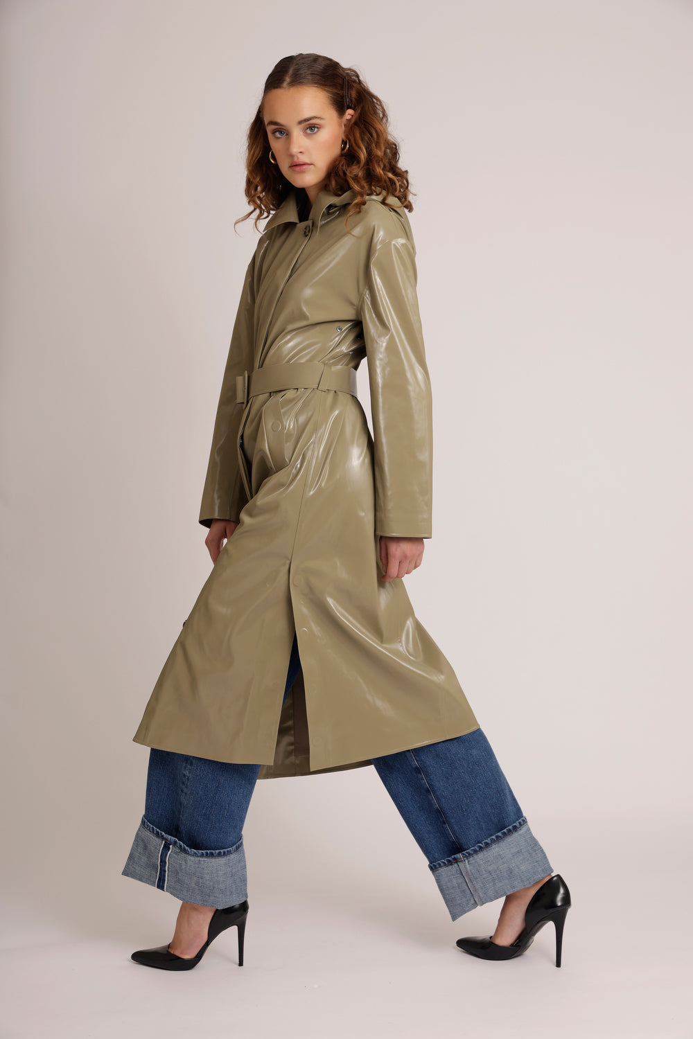 This laque trenchcoat features a soft thin fleece lining to prevent the material from feeling cold against your skin. We kept the design simple yet elegant with glued elements for a seamless look, including side panels with magnetic closures, cuffs, hemline, pockets, belt, and collar. Available in cognac, grey, and taupe, it offers a stylish, practical solution for fashion-forward individuals.