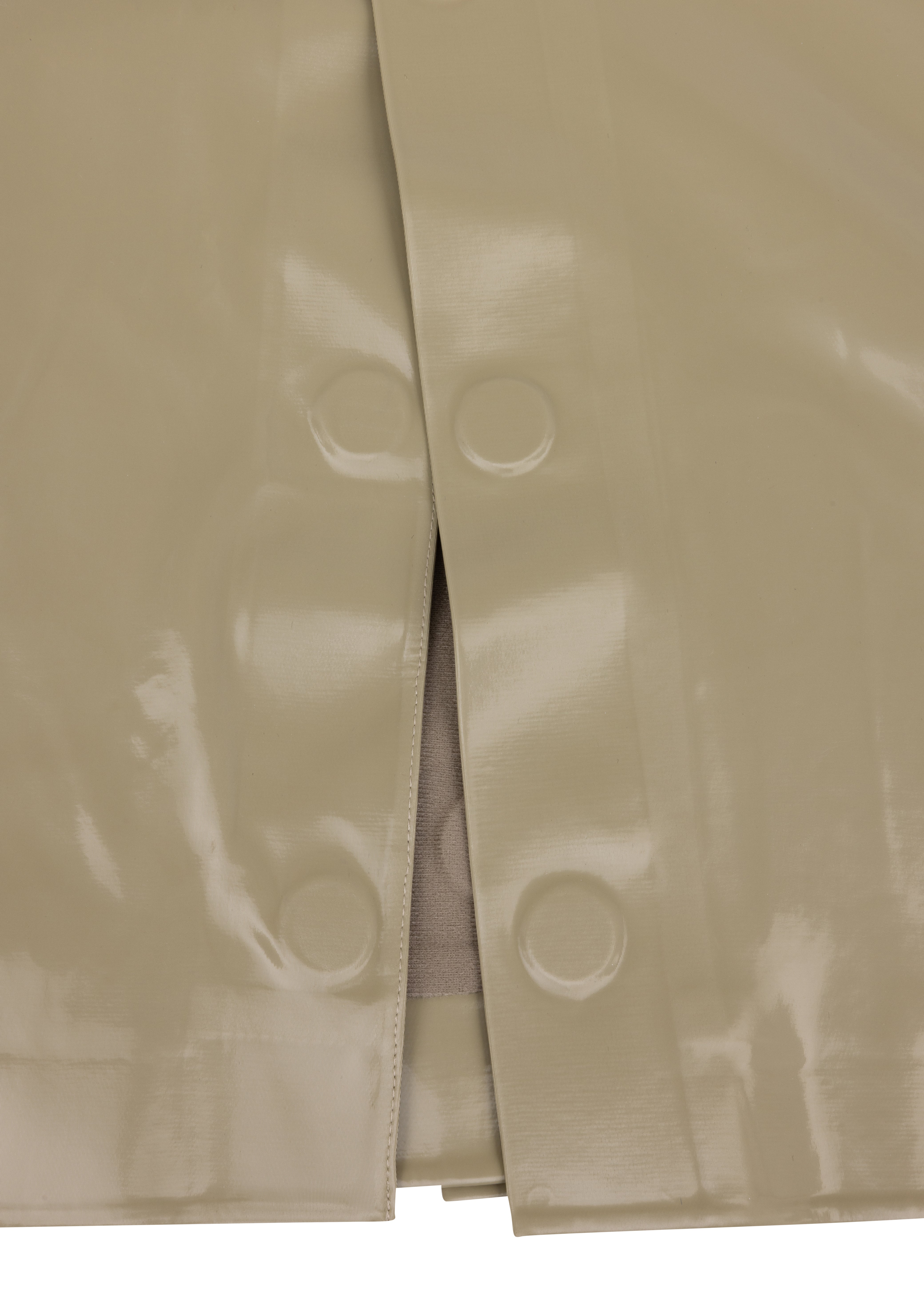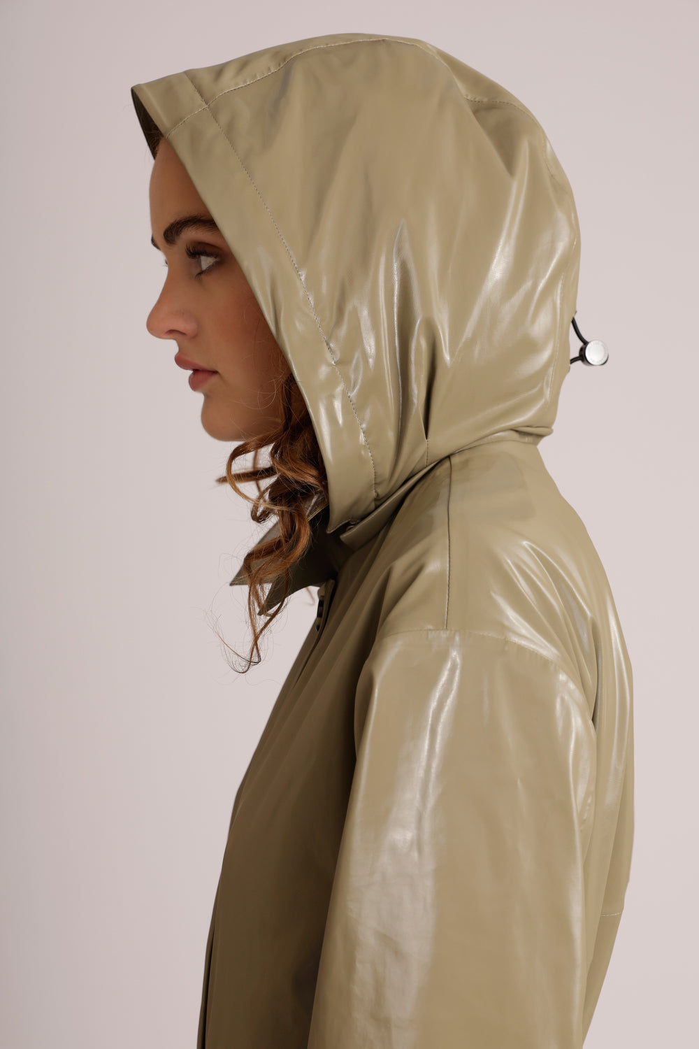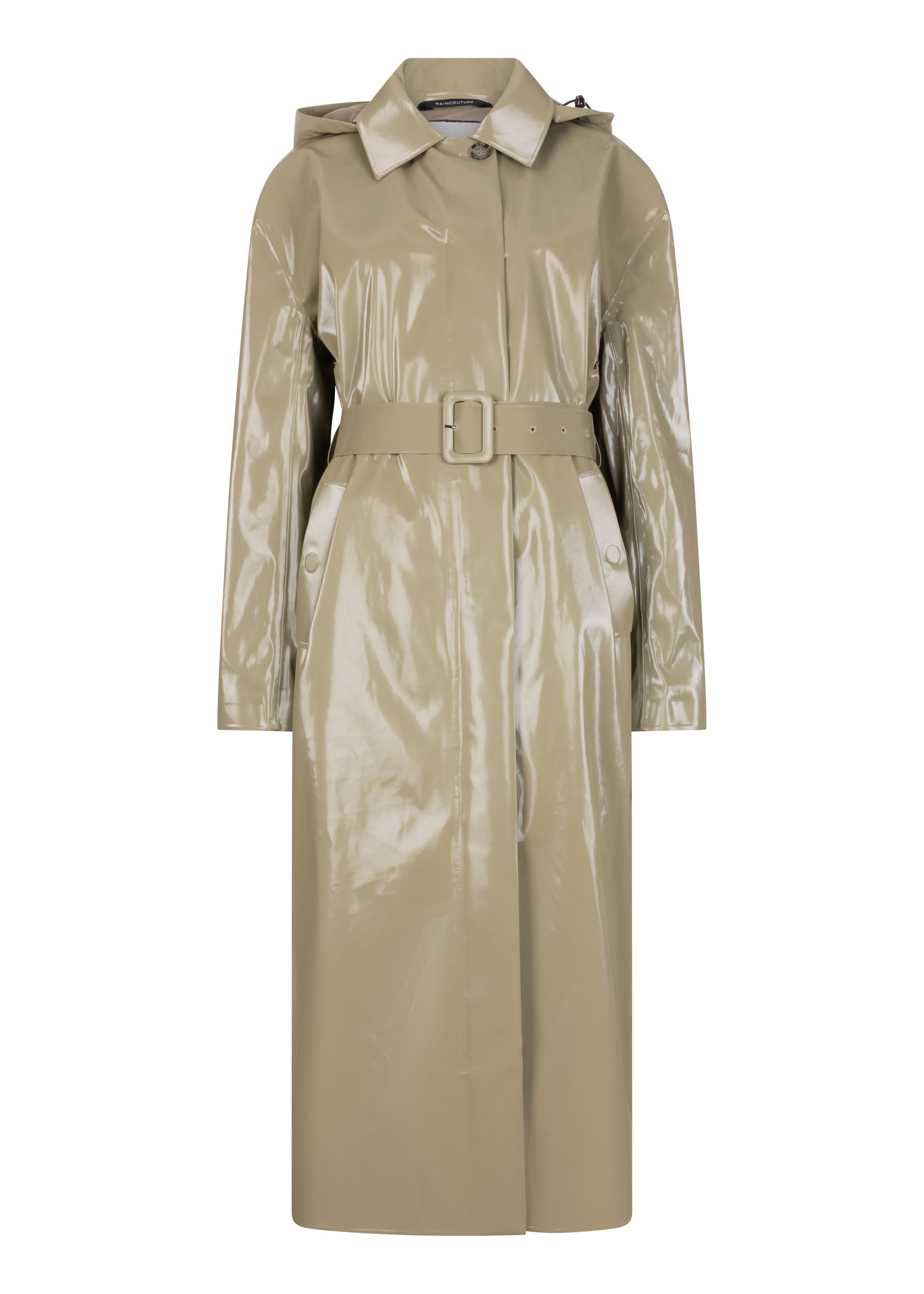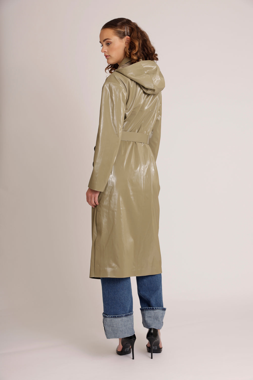 This laque trenchcoat features a soft thin fleece lining to prevent the material from feeling cold against your skin. We kept the design simple yet elegant with glued elements for a seamless look, including side panels with magnetic closures, cuffs, hemline, pockets, belt, and collar. Available in cognac, grey, and taupe, it offers a stylish, practical solution for fashion-forward individuals.
