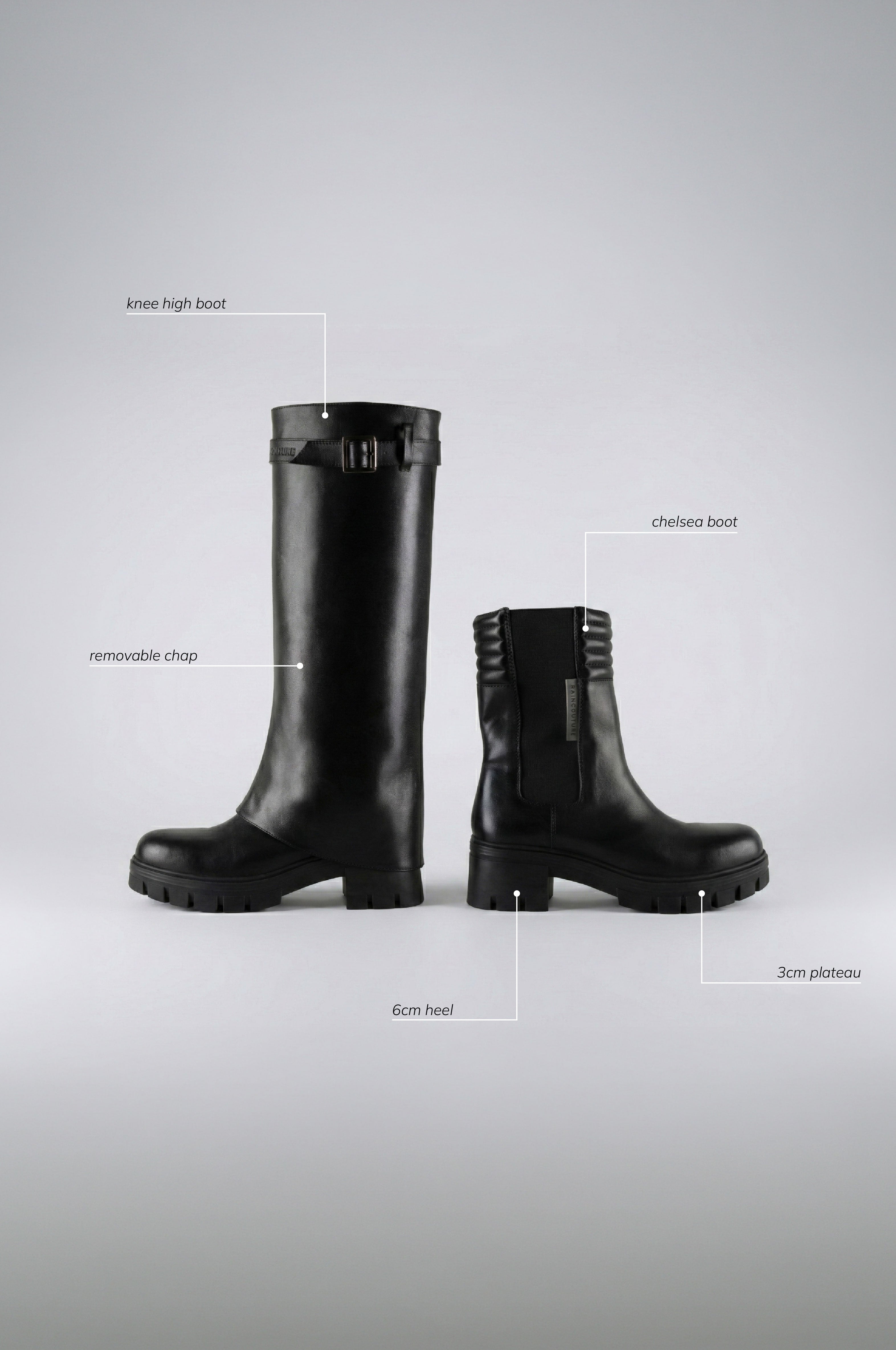 We designed these waterproof boots to keep your feet dry and comfortable in any situation. Crafted from soft materials, they offer exceptional versatility: wear them as a classic Chelsea boot, or add the removable chap for a knee-high silhouette that provides extra protection and a refined touch. The chap can also be styled with other shoes or boots, allowing for endless combinations.